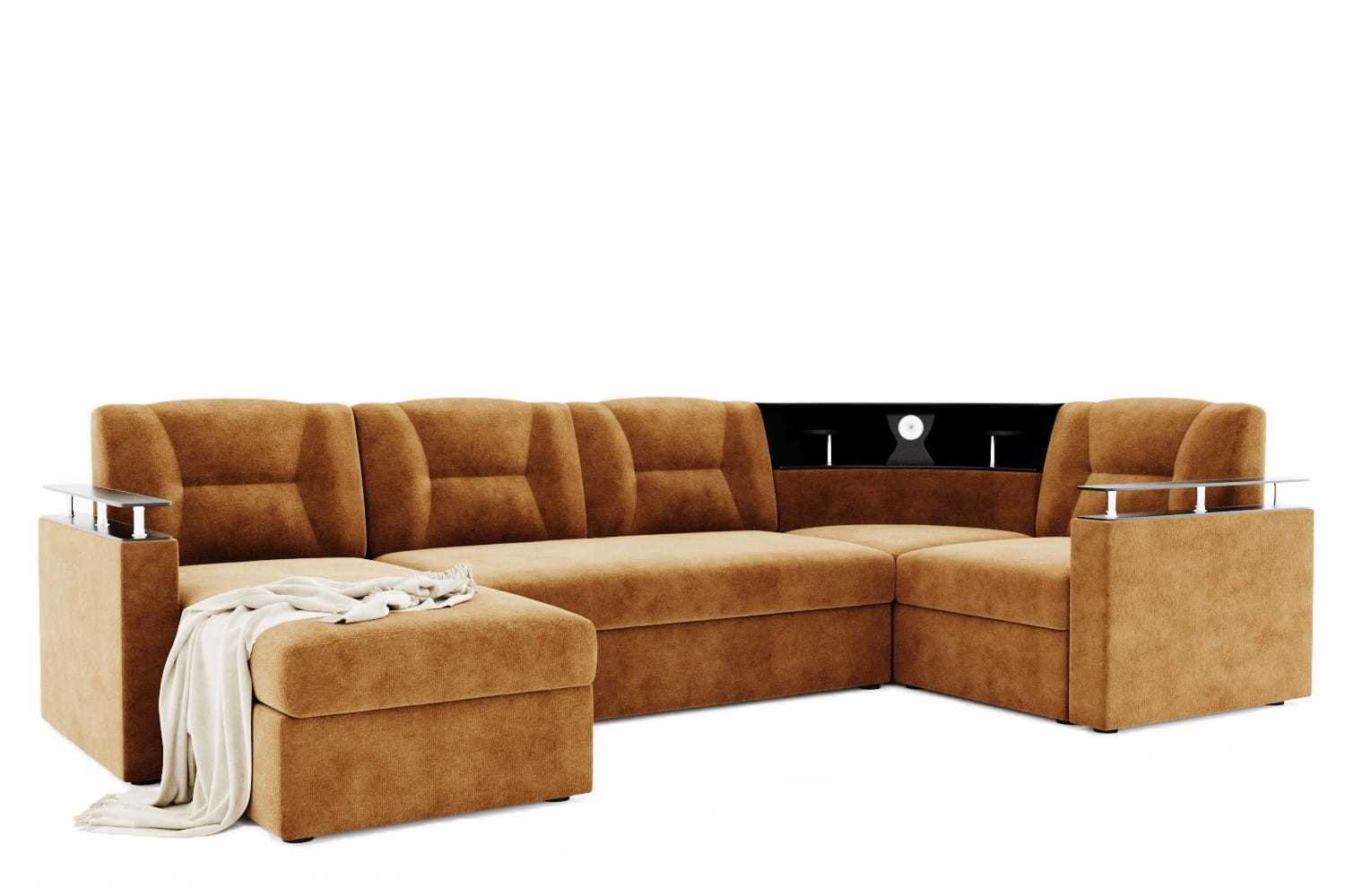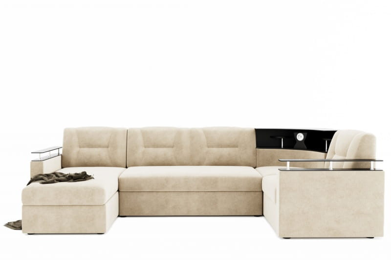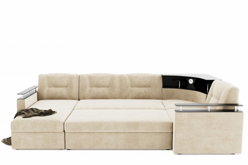 Особенности дивана: Просторный угловой диван на ППУ с оттоманкой. Практичный и вместительный, изготавливается с удобной барной стойкой. Оснащён механизмом трансформации "дельфин", а также оттоманкой с подъёмником, что является несомненным преимуществом. Размер подлокотников (ШхГ): 120х900 мм. Подсветка крепится к барной стойке ЛДСП (штекер в комплект не входит, его необходимо приобретать отдельно).
