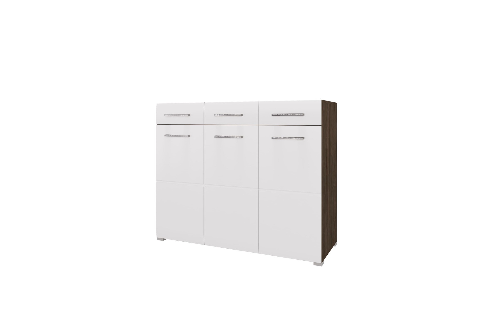 Особенности комода: Удобный и вместительный. На глянцевых фасадах горизонтальная фрезеровка. Отлично подойдёт для гостиной, спальни, прихожей или кабинета. Класс токсичности материалов – Е1. Кромка корпуса ПВХ 0,4 мм, производитель Kronospan. Роликовые направляющие бренда BOYARD. Содержит три выдвижных ящика для мелочей и два больших шкафчика с полками.