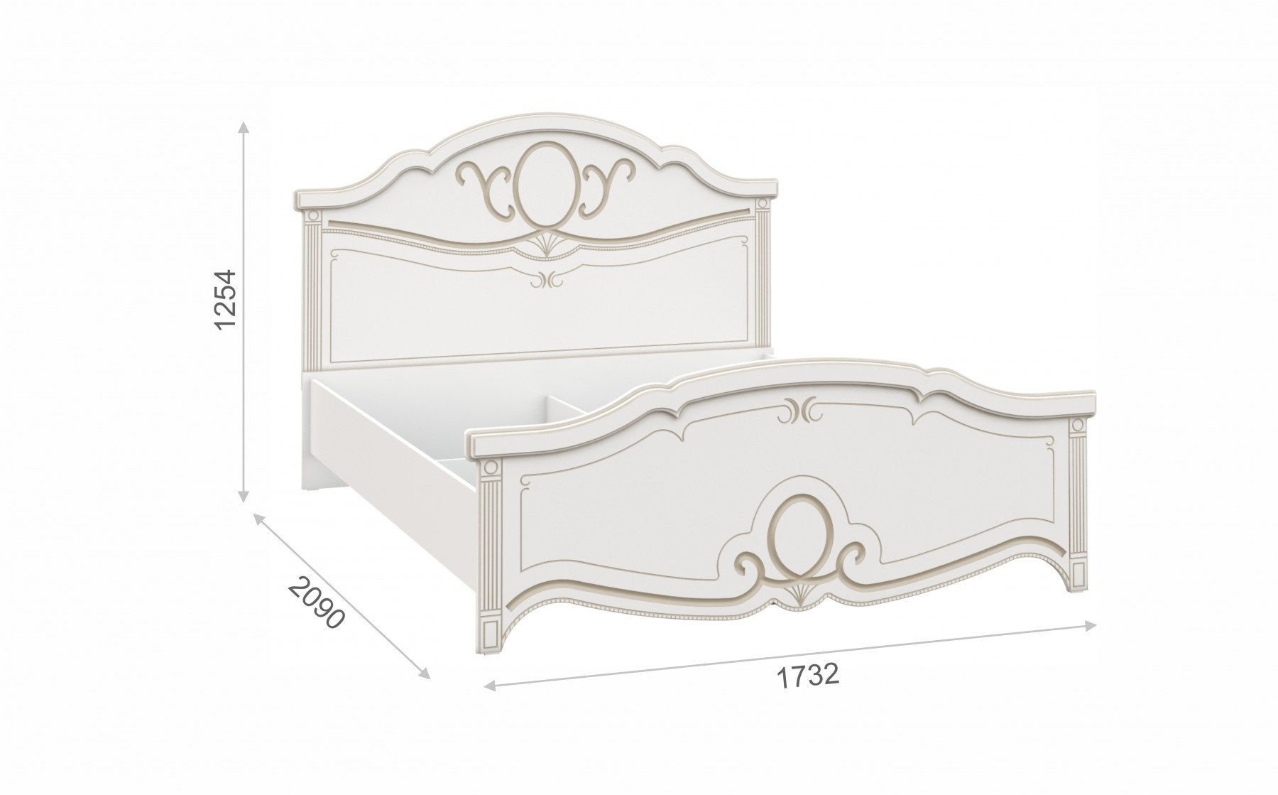 • Кровать: Ширина 1732 мм х Глубина 2090 мм x Высота 1254 мм/ Спальное место 1600 x 2000мм)